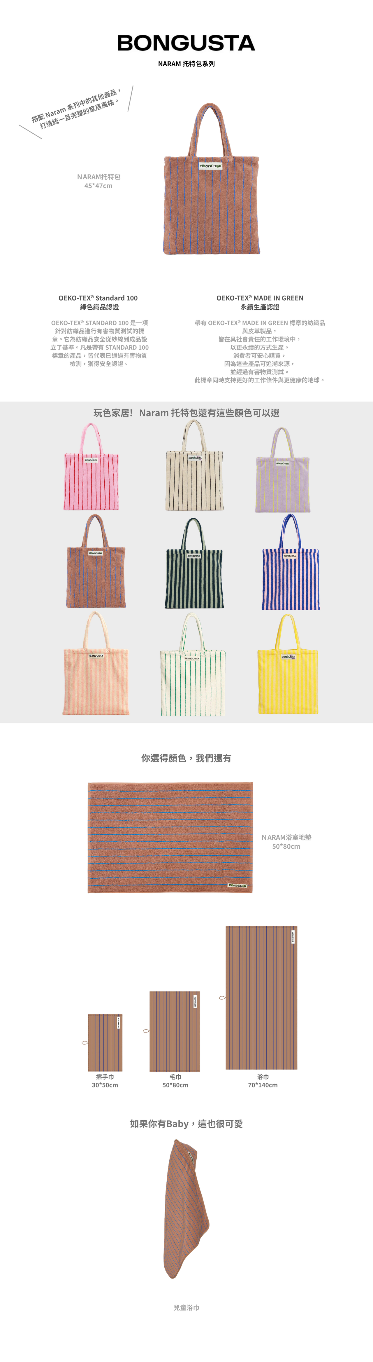 Naram 托特包 採用 100% 有機棉 製成,並通過 OEKO-TEX® 認證。包袋設有 大容量主隔層,非常適合日常使用。以Bongusta經典 招牌色系與條紋款式,經典耐看。建議首次使用前先清洗,以獲得最佳質感。