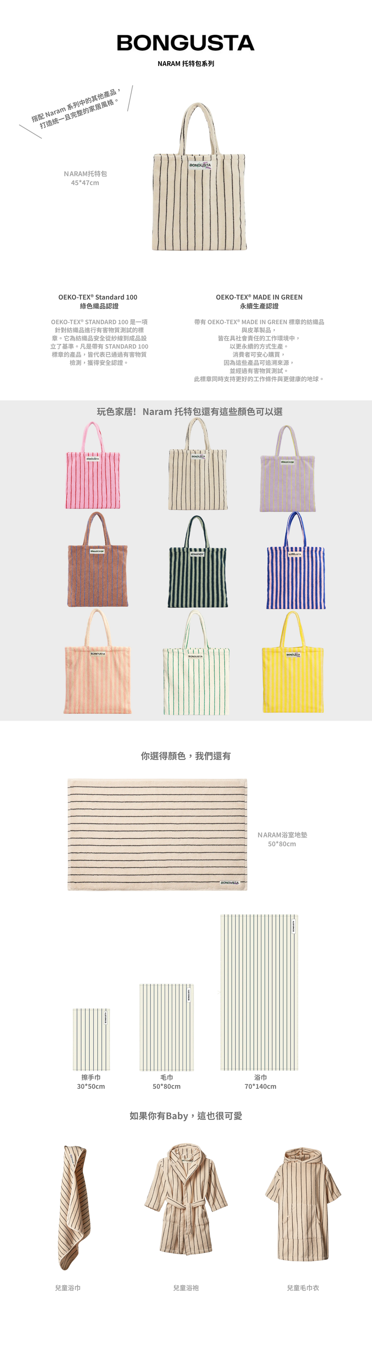 Naram 托特包 採用 100% 有機棉 製成,並通過 OEKO-TEX® 認證。包袋設有 大容量主隔層,非常適合日常使用。以Bongusta經典 招牌色系與條紋款式,經典耐看。建議首次使用前先清洗,以獲得最佳質感。