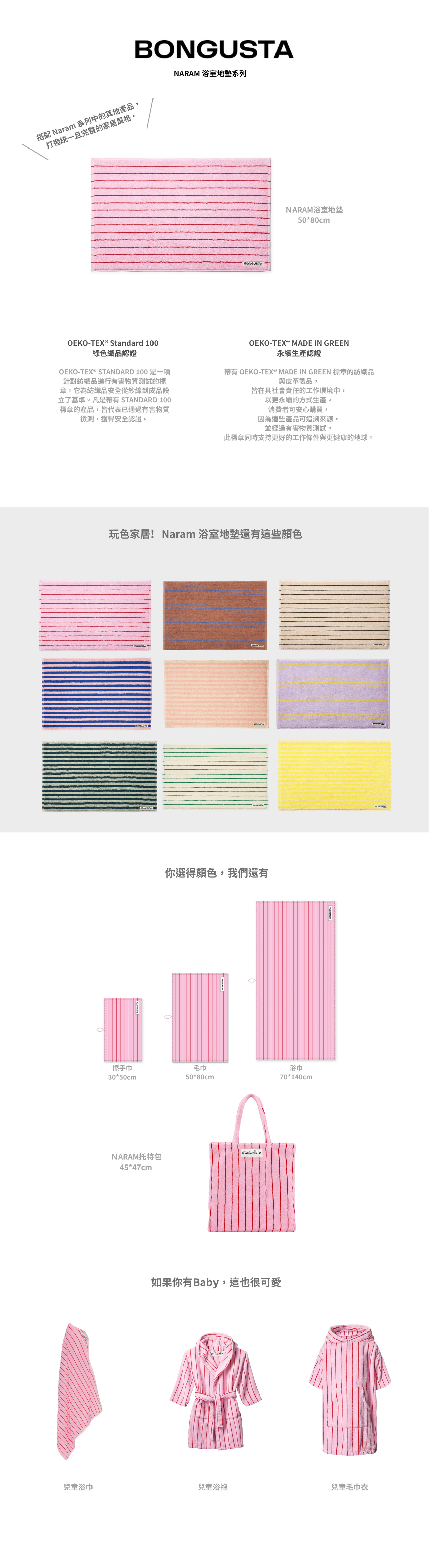 Naram 浴室地墊 採用 100% 有機棉 製成,並通過 OEKO-TEX® 認證。地墊以雙股紗織造,具有高吸水性、耐用性佳與極致柔軟的特性。尺寸為 50 x 80 公分。可搭配 Naram 系列 其他產品,打造完整一致的浴室風格。