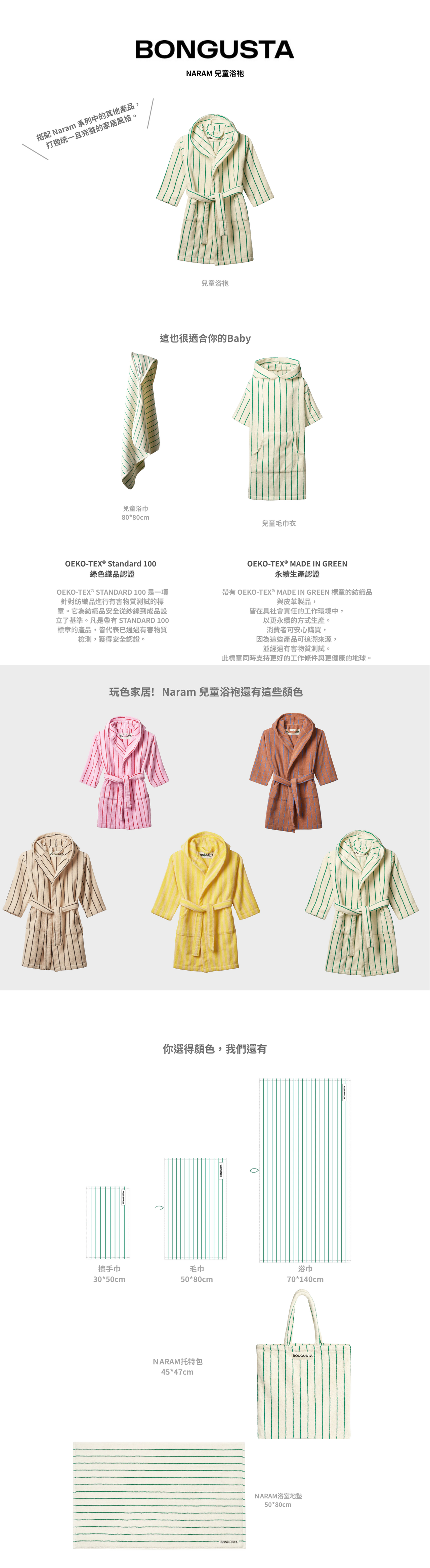 Naram 兒童浴袍採用 100% 有機棉製成,並通過 OEKO-TEX® 認證。浴袍以雙股紗織造,具備高吸水性、長久耐用性與極致柔軟的觸感。