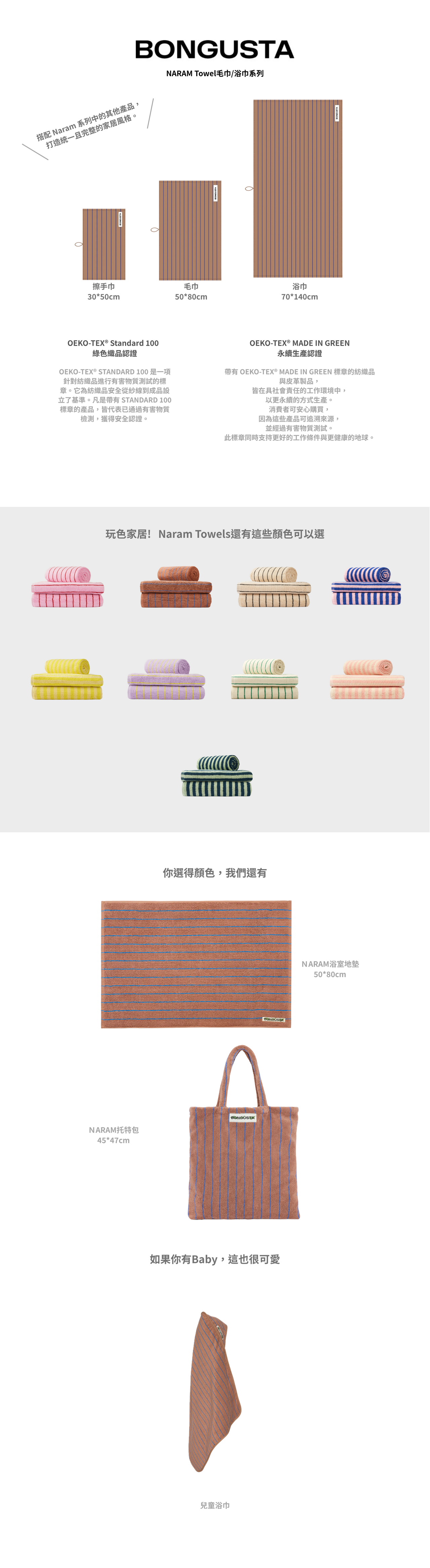 Naram 毛巾以 100% 有機棉 製成,並通過 OEKO-TEX® 認證。