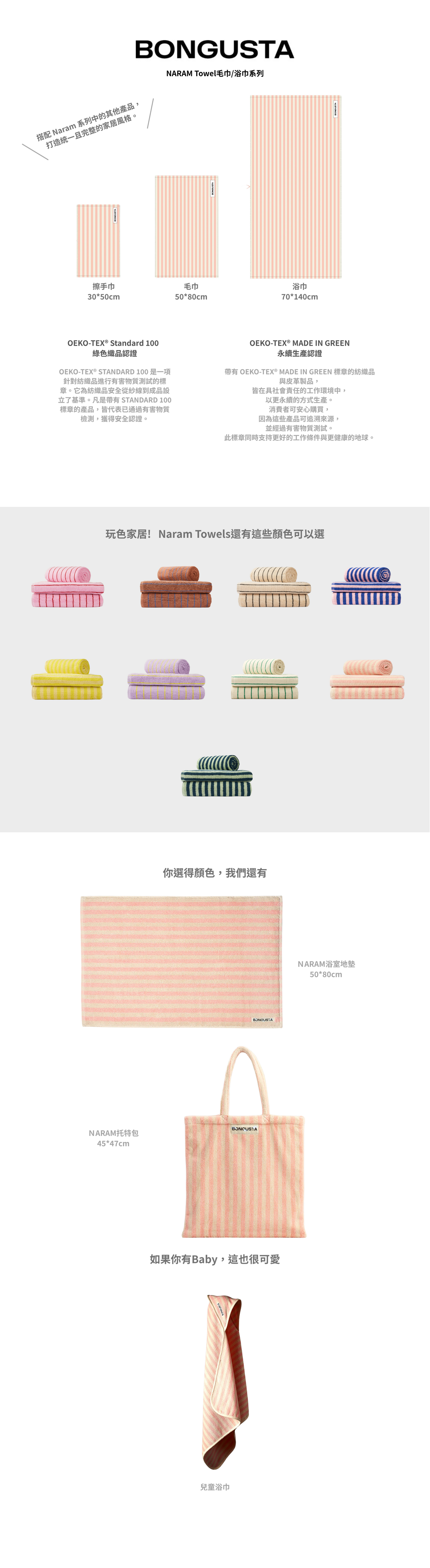 Naram 毛巾以 100% 有機棉 製成,並通過 OEKO-TEX® 認證。