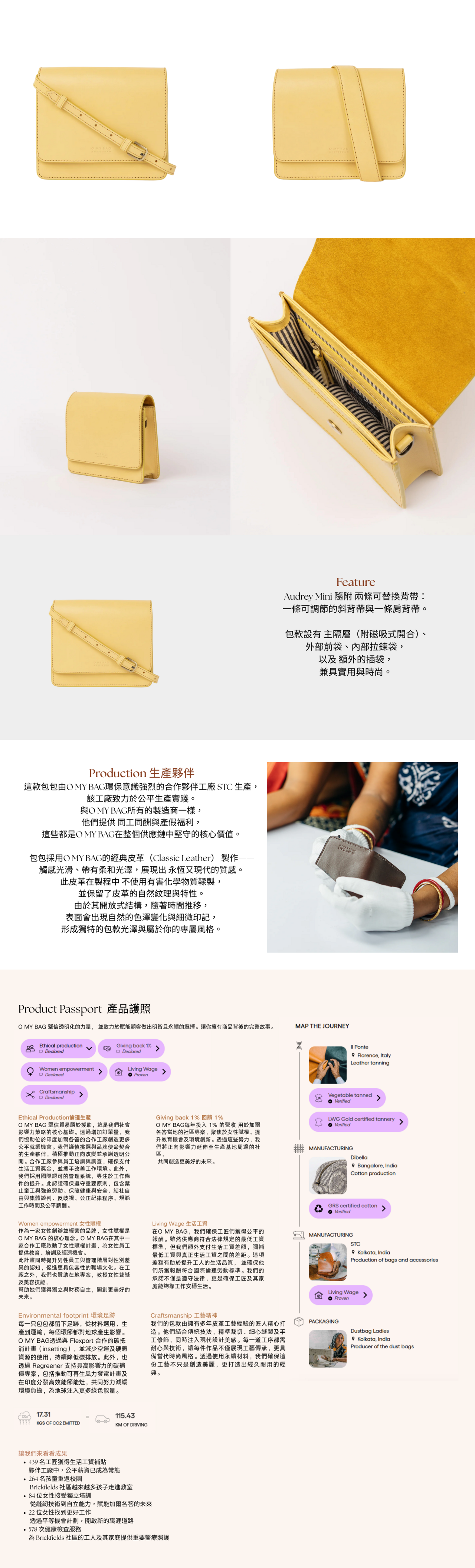 奶油黃(Butter Yellow)——本季最流行的色彩,首次以限量版亮相於 O MY BAG系列。這款 Audrey Mini 奶油黃包不僅採用全新獨家色調,還配有 皮革肩背帶與可調節皮革斜背帶,展現極致多變的穿搭風格。