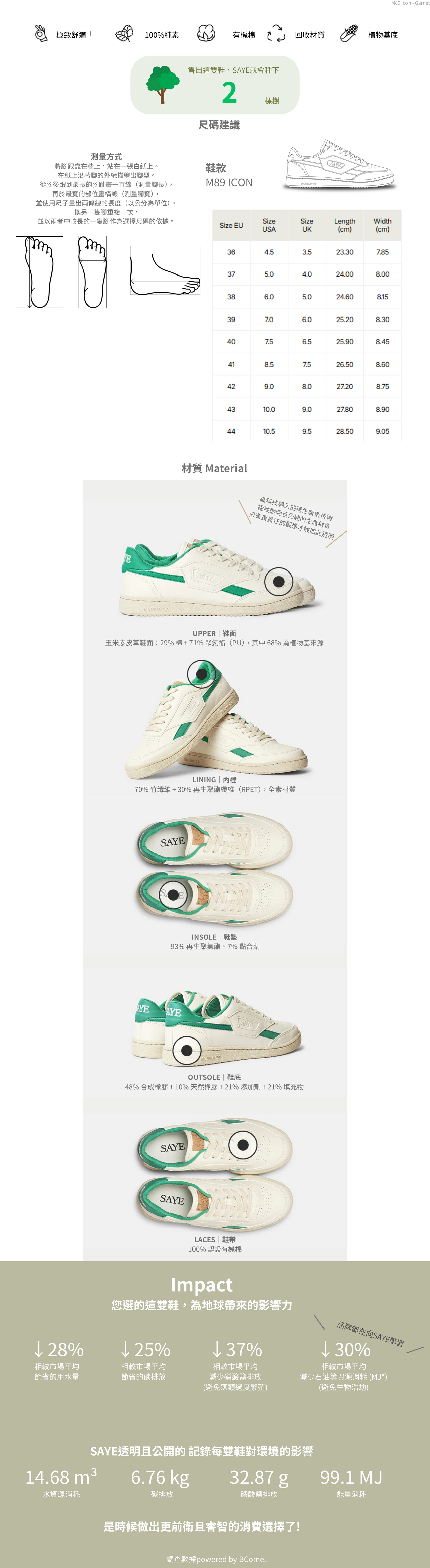 • 永續承諾: 每售出一雙球鞋,SAYE將資助種植 兩棵樹 (看greenspark追蹤SAYE的植樹紀錄https://reurl.cc/Eb8lpm)