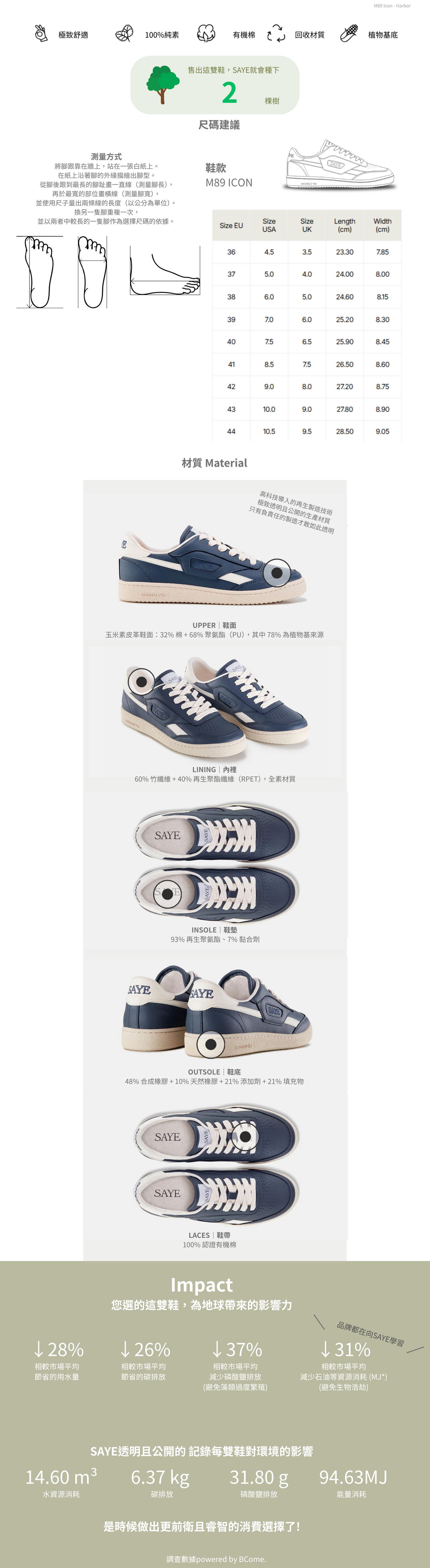 M89 Icon 是SAYE核心系列的一部分。這款復古靈感球鞋兼具 時尚感與多功能性。多年來,SAYE持續調整與優化鞋型,確保 舒適度極佳,同時實現 環保生產。這款鞋型是 SAYE 的經典款式,從高品質手感到舒適穿著感,都是品牌的代表之作。