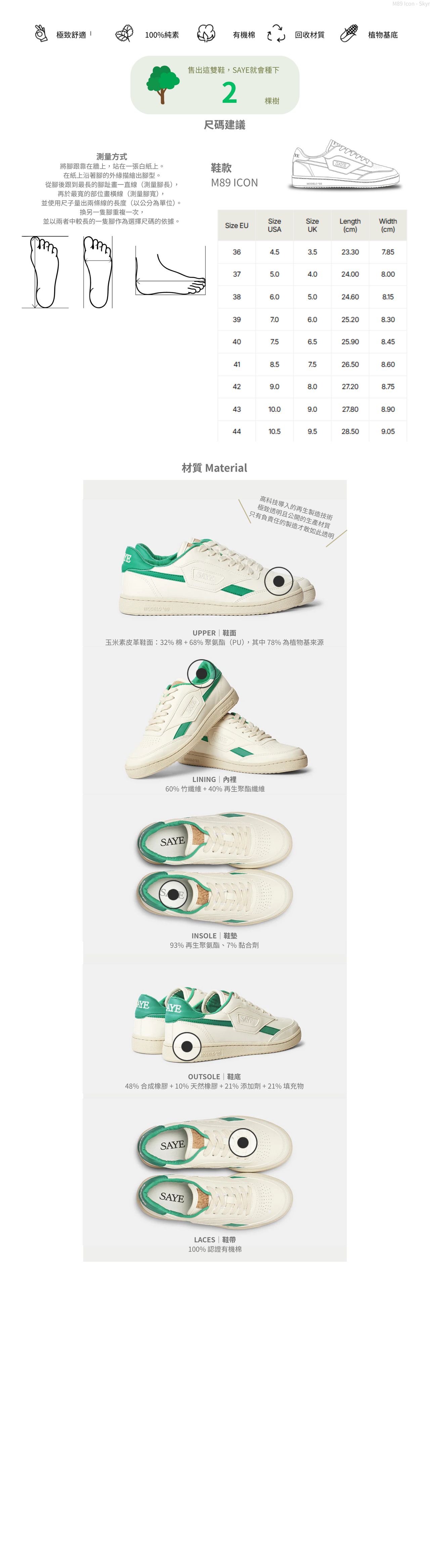 • 永續承諾: 每售出一雙球鞋,SAYE資助種植 兩棵樹 (看greenspark追蹤SAYE的植樹紀錄https://reurl.cc/Eb8lpm)